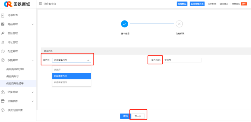 步骤2:【角色组】:选择“供应商操作员”,【角色名称】:根据角色定位手动填写,点击【下一步】。