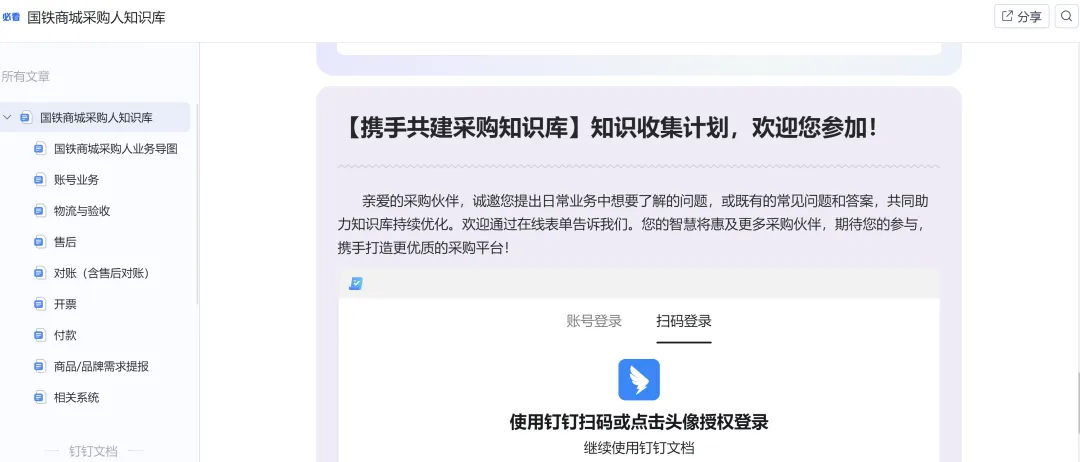 知识库全面支持钉钉、微信及网页等多渠道便捷登录,或通过扫码轻松访问,实现“一秒即连、随时查阅”的移动化体验,为所有关注商城业务的用户提供高效便捷的移动端知识服务。