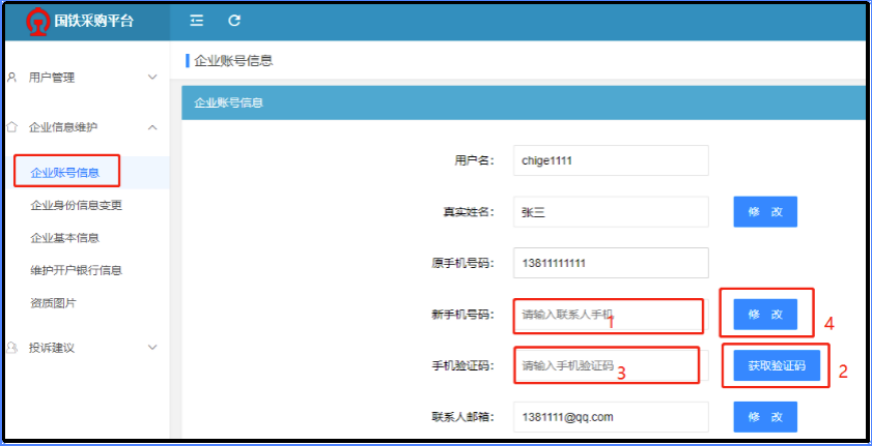 ( 1 )用户可修改姓名、手机号和邮箱号。 姓名、邮箱号可直接修改(无需通过审核),用户名不可修改。 ( 2 )修改注册手机号 :输入新手机号 — 点击【获取验证码】 — 填写验证码 — 点击【修改】。 入驻国铁商城的商户如需更改店铺名称和电话,可以在商城运营中心下的“供应商中心”进行店铺名称和电话的修改。