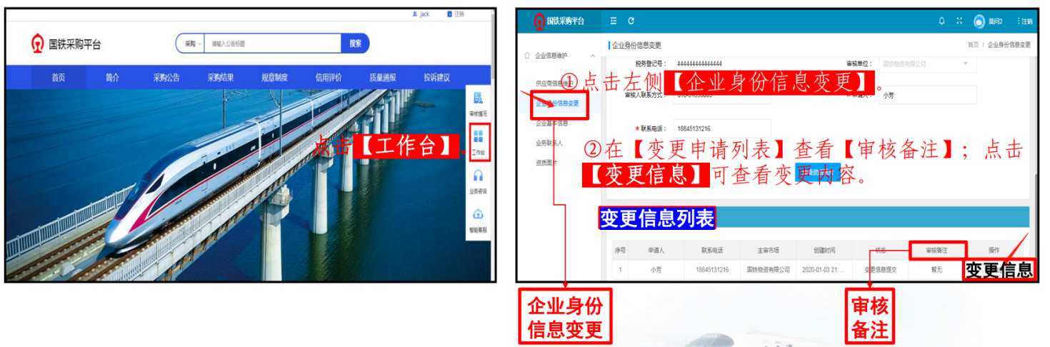 ( 2 )用户在初审后,如需进行企业信息变更后的注册信息查询,可进入企业账号后,点击右侧【工作台】在【企业信息维护】下方点击【企业身份信息变更】,在弹出页面可查看【变更申请列表】相关内容。