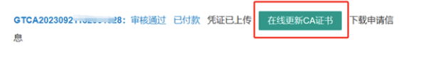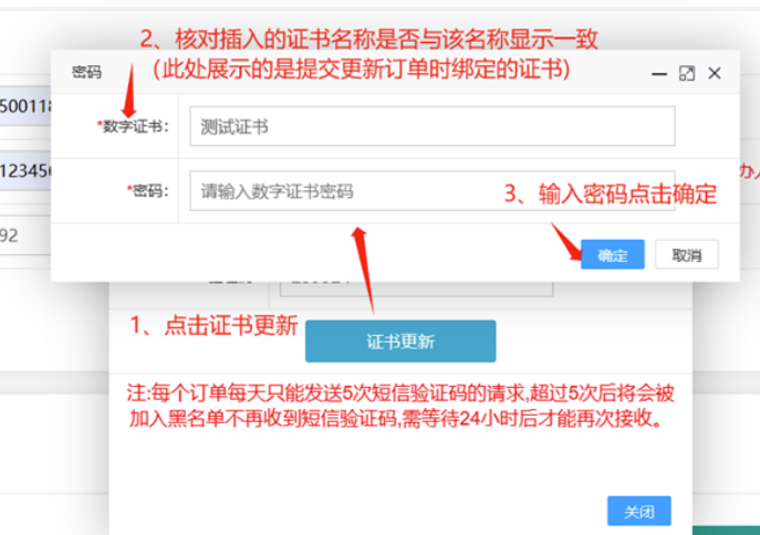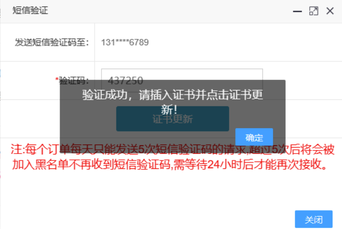 确认收款后,点击“在线更新 CA 证书” ,弹出短信校验 窗口,点击获取验证码,系统自动发送短信验证码到经办人 手机上,输入验证码后,点击验证按钮,根据提示信息,插 入待更新的 CA 数字证书,点击证书更新按钮,输入 CA 数 字证书 USBKey 的密码后点击“确定”,等待 5~10 秒,即可 更新数字证书。(注意:需与提交订单时插入校验的 CA 数 字证书 USBKey 是同一个)