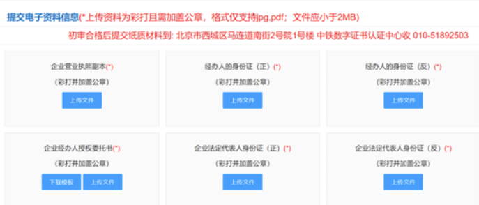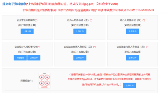 申请印章,需要提交电子资料相关信息,支持 jpg、pdf 格式的图片,文件应小于 2M,所提供信息将用于制作证书 审核,请务必上传真实信息。