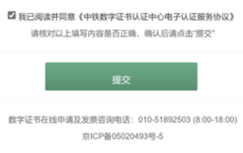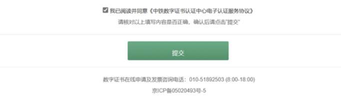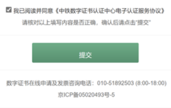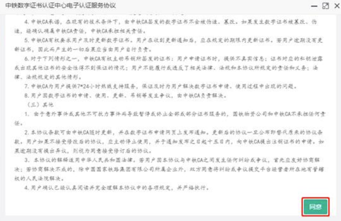 点开《中铁数字证书认证中心电子认证服务协议》,阅 读协议后,点击“同意”按钮,回到提交界面。
