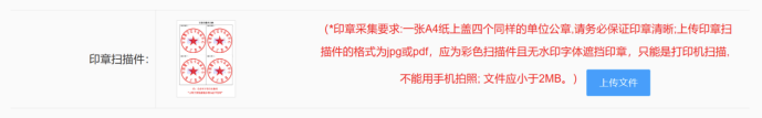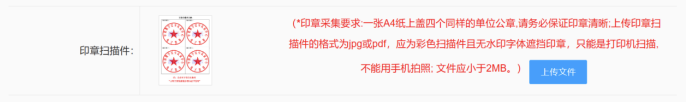 请使用真实印章在 A4 纸上盖完章后进行扫描,印章需 清晰可辩,每张 A4 纸上盖 4 个同样的印章,方便制作证书 时取印。上传文件支持 jpg、pdf 等文件,文件应小于 2M。 (请注意不要使用电子印章全彩打印,将影响业务正常办理)