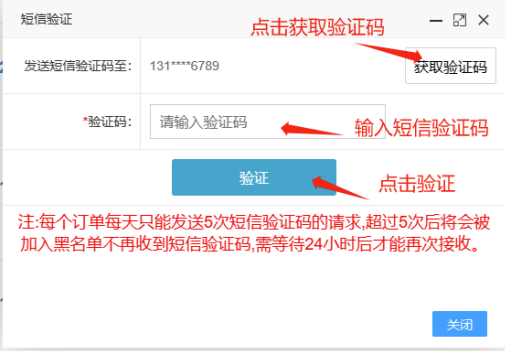 2.5 点击“获取验证码”按钮,系统自动发送短信到经办 人手机,输入短信验证码后,点击验证按钮,验证通过即可 修改订单。
