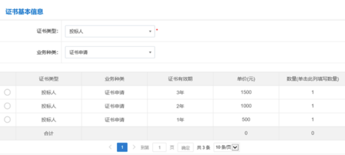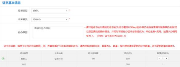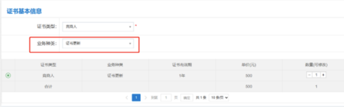 根据需要申请证书类型、业务种类并在列表中进行勾选, 勾选后系统自动在下方核算金额。
