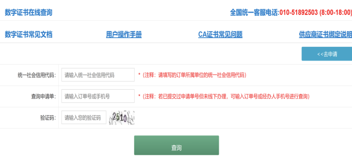 2.1 在数字证书查询页输入统一社会信用代码、查询单 号或者经办人的手机号码、验证码,点击“查询”按钮,可查 看数字证书的办理进度。如需申请,可以点击“去申请”按 钮进行申请。