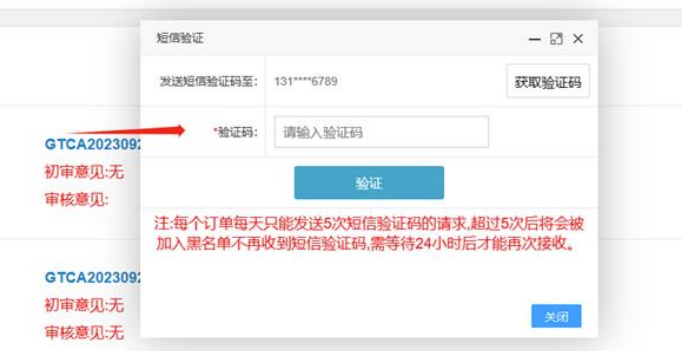 2.4 初审不通过,按初审意见修改,点击订单号,弹出短 信验证窗口,验证通过即可修改。