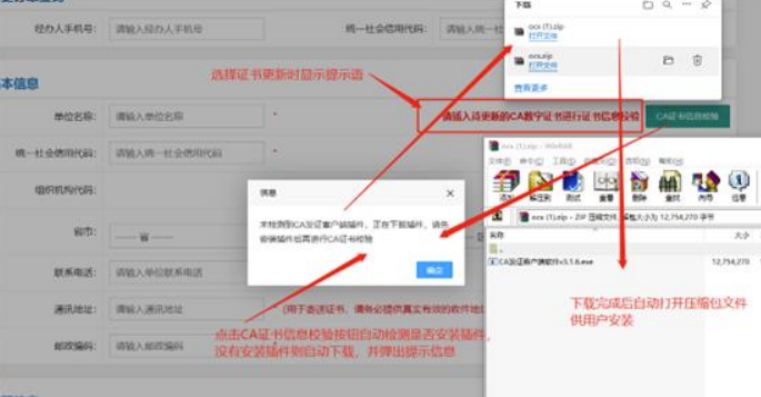 填写完成后请插入“待更新”的数字证书进行证书信息校 验。点击“CA 证书信息校验” (校验原单位名称、统 一社会信用代码),校验时会自动检测终端是否安装“CA 发 证客户端插件”,如未安装系统自动弹窗下载,并弹出提示信 息,下载完成后自动打开压缩包文件,需要手动点击插件并 点击“安装→下一步→完成。”