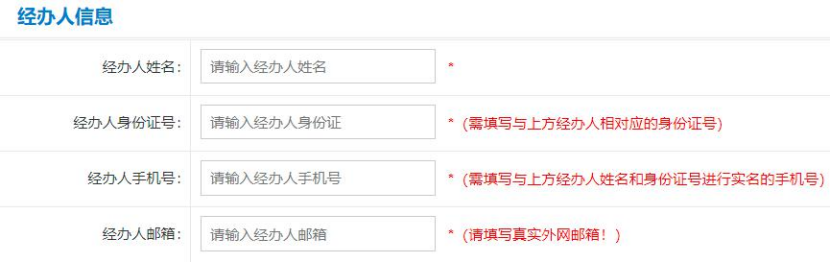 经办人手机号需填写由经办人身份证及姓名实名认证的手机号。经办人邮箱用于接收发票邮件使用,请务必提供真实有效邮箱。