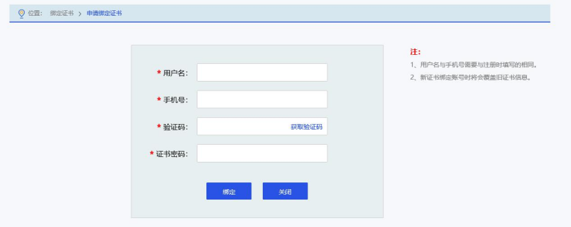 步骤2: 跳转至申请绑定证书页面后,填写在国铁采购平台的注册用户名及注册手机号,点击获取验证码,输入正确验证码,输入正确的证书密码后点击“绑定”按钮,提示绑定证书成功,即完成CA数字证书与国铁采购平台账户绑定与证书的更新。